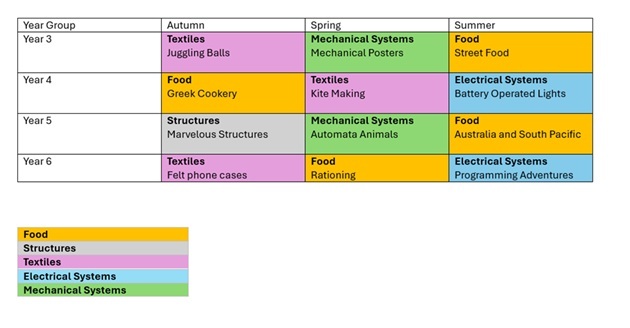 We teach Design and Technology within topic learning as well as subject specific days. The National Curriculum is followed to include: