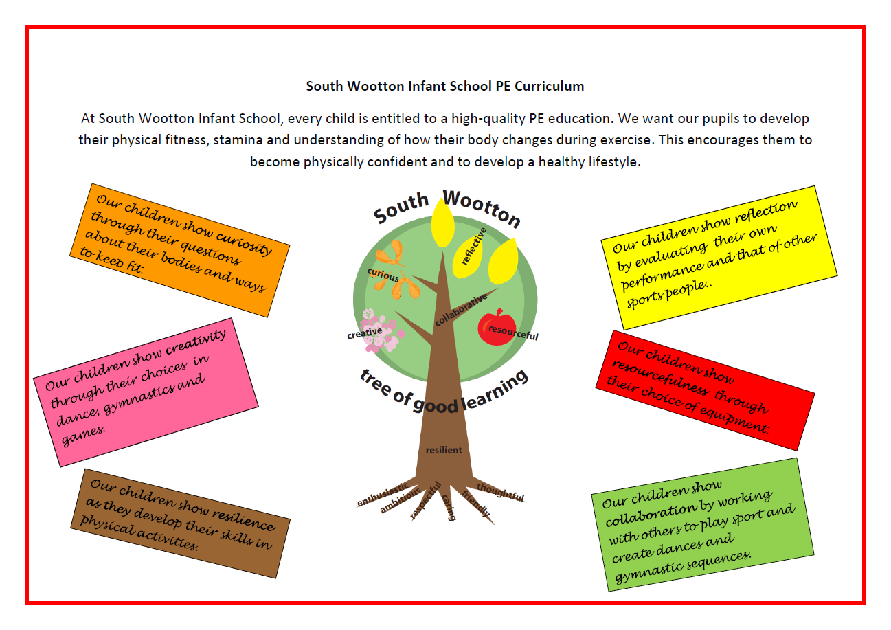- At South Wootton Infant School, we ensure that our PE curriculum is progressive and allows children to develop fundamental skills and apply them to a variety of sports and activities. All children are provided with the opportunities to develop skills and to achieve their personal best.