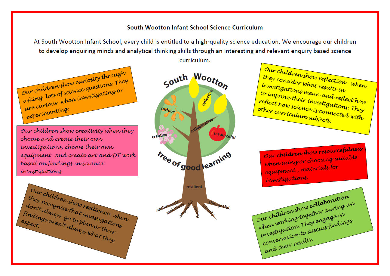 At South Wootton Infant, we believe that every child should be entitled to an inclusive, high quality science education. We aim to provide a broad, balanced and differentiated curriculum where pupils develop the knowledge, skills, vocabulary and a love of science. Our aim is for a science curriculum that engages, inspires and challenges pupils to create their own investigations and ensure that they gain the knowledge and skills to develop their knowledge and learn how science is used in the wider world as well as how famous scientists have influenced the world in which we live today.
